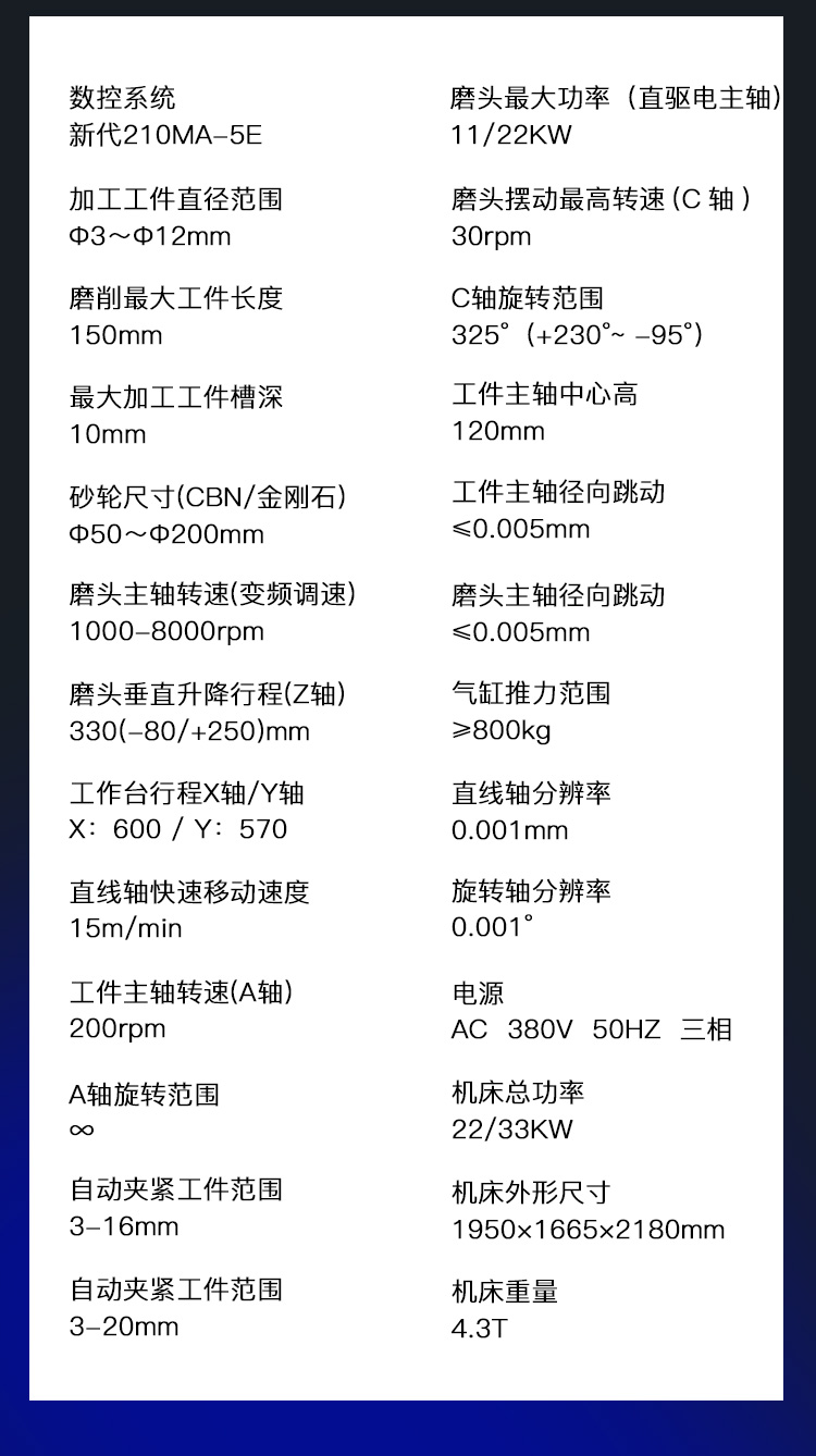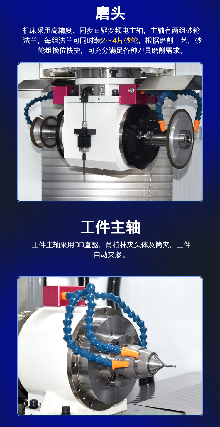 機(jī)床采用高精度、同步直驅(qū)變頻電主軸,主軸有兩組砂輪法蘭,每組法蘭可同時(shí)裝2~4片砂輪,根據(jù)磨削工藝,砂輪組換位快捷,可充分滿足各種刀具磨削需求。