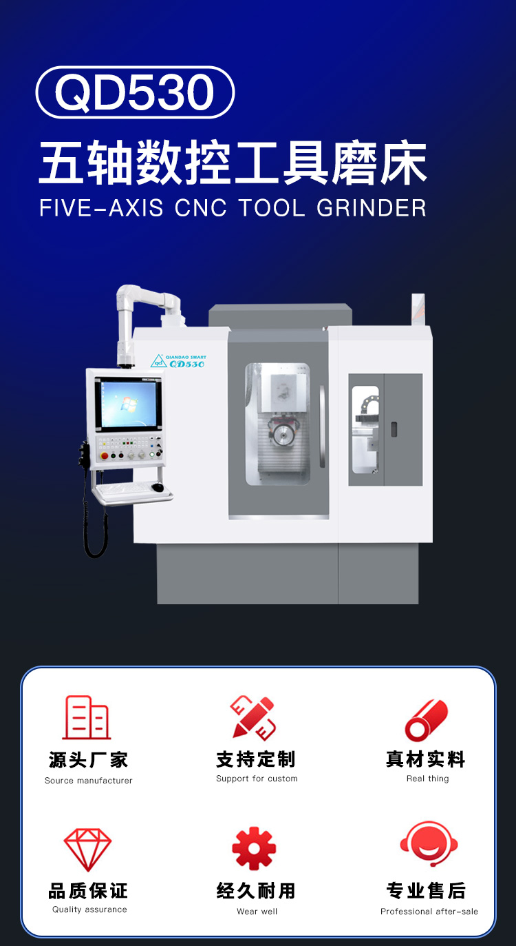 QD530是千島公司新研發(fā)的五軸五聯(lián)動(dòng)數(shù)控工具磨床,是一款高性價(jià)比刀具磨床,適用于生產(chǎn)或修磨各類銑削類刀具、鉆削類刀具、成形刀具等。